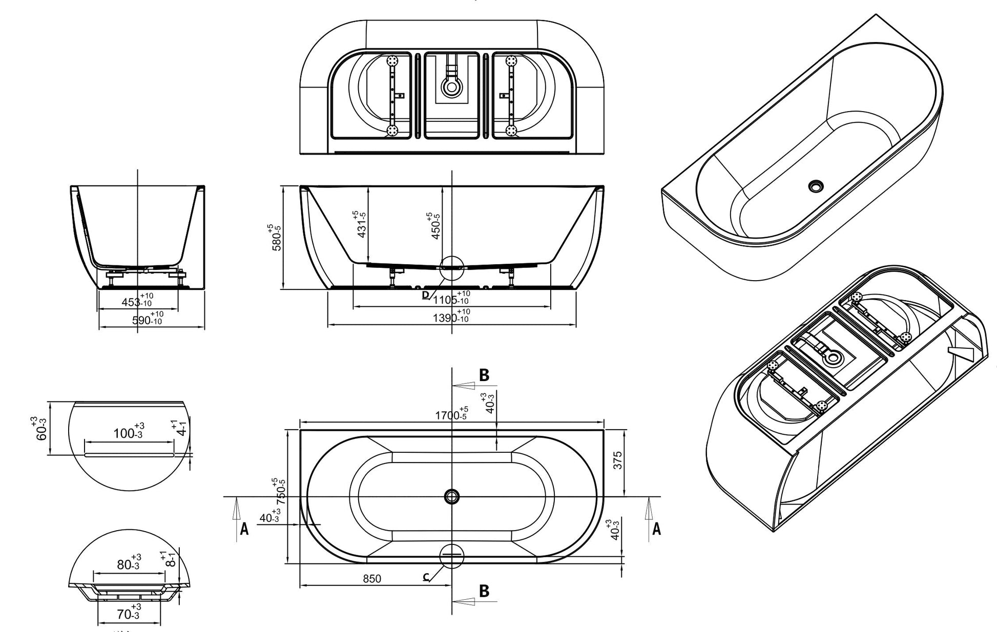 Liora half vrijstaand ligbad 170 x 75 cm acryl glans wit met waste glans wit