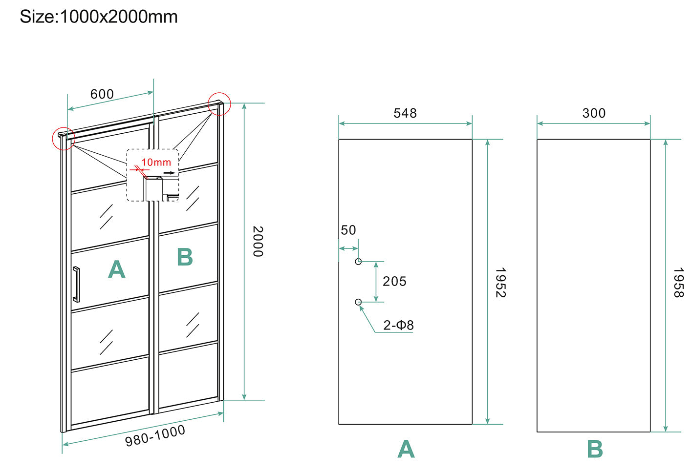 • - Breedte: 90 cm - Hoogte: 200 cm - Deur: 60 cm, Vast paneel: 40 cm - Verstelbereik: 2 cm (98-100 cm)