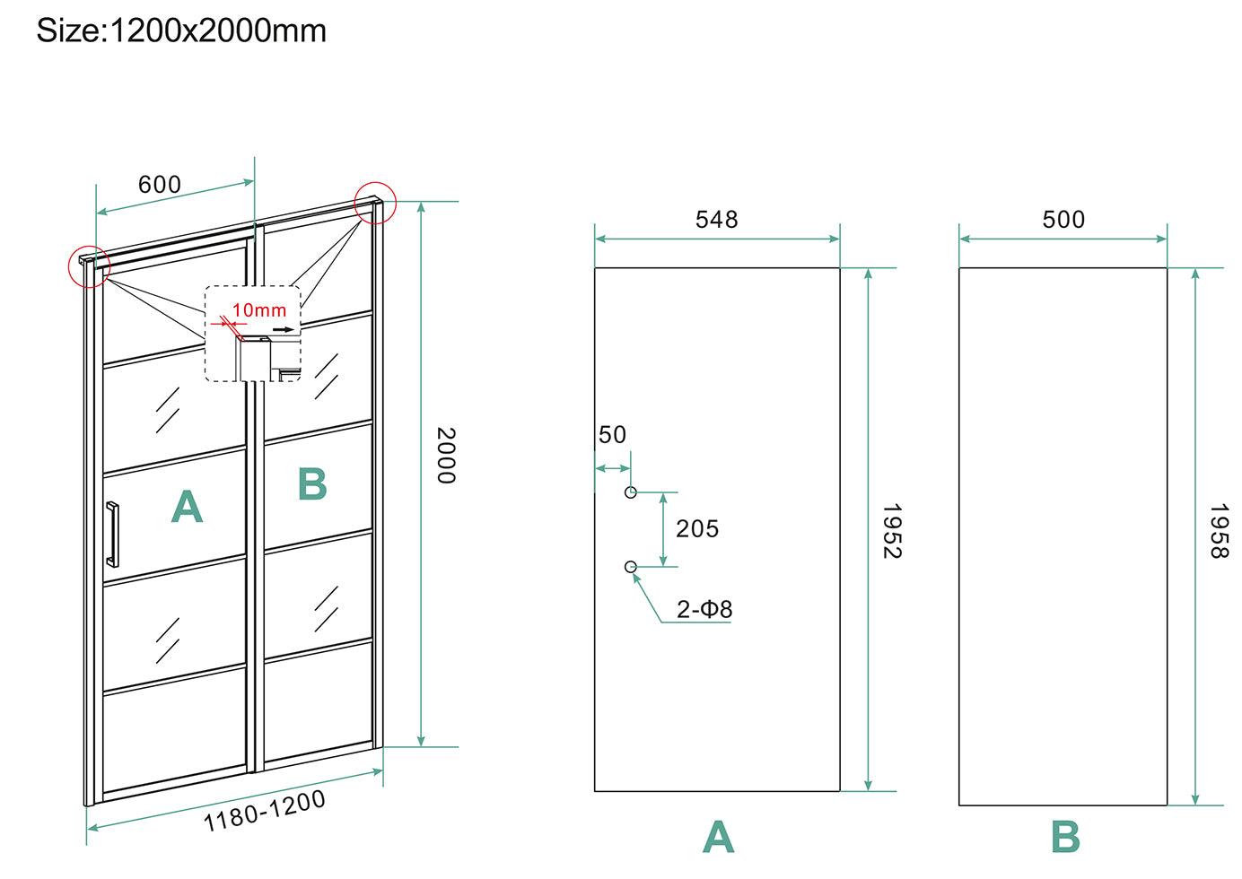 Horizon nisdeur met vast deel en raster 1200 x 2000 x 8mm nano helder glas/mat zwart