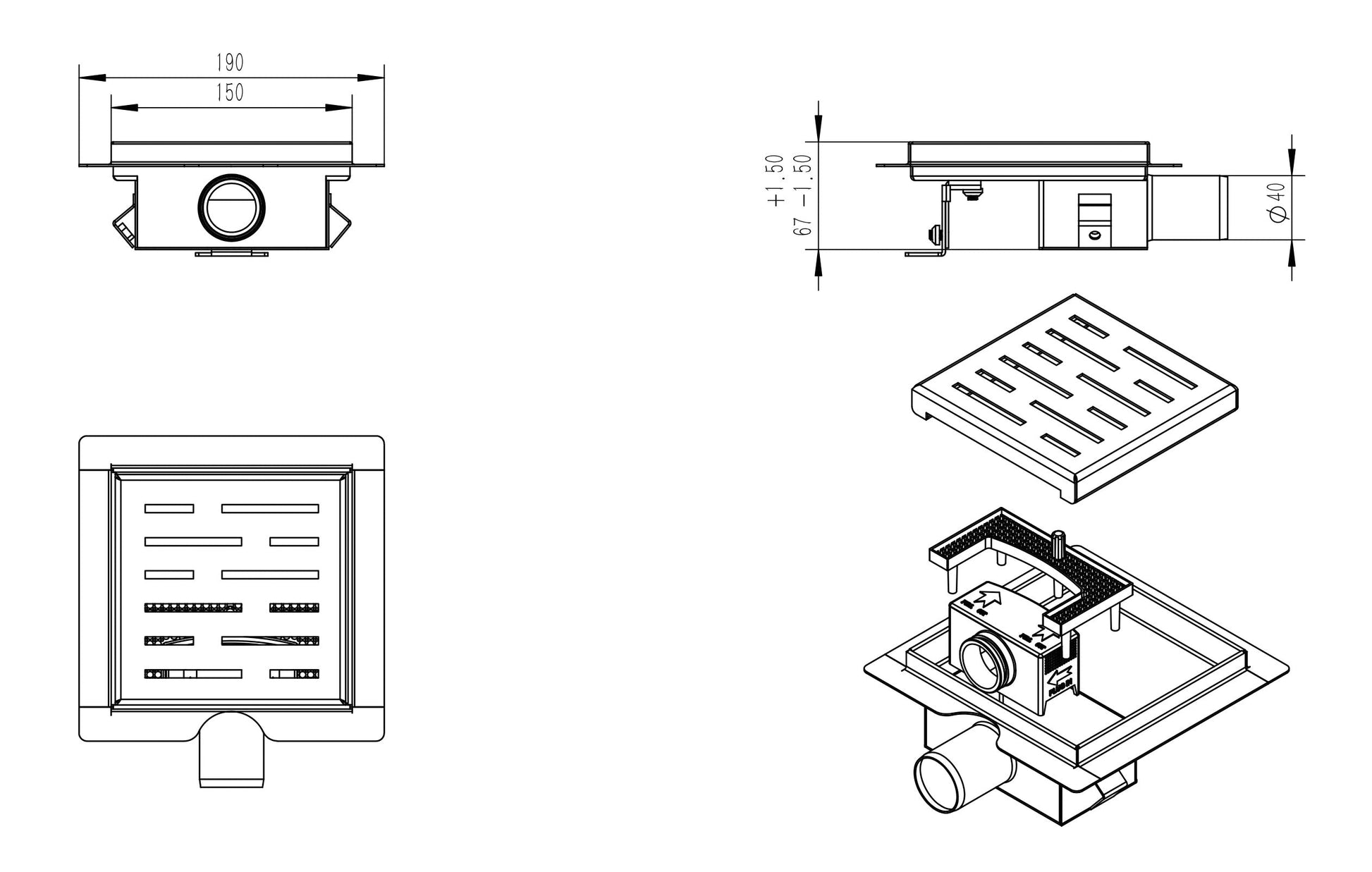 Specificaties Doucheput Wiesbaden met Flens en Zijuitlaat 15x15 cm Mat Zwart