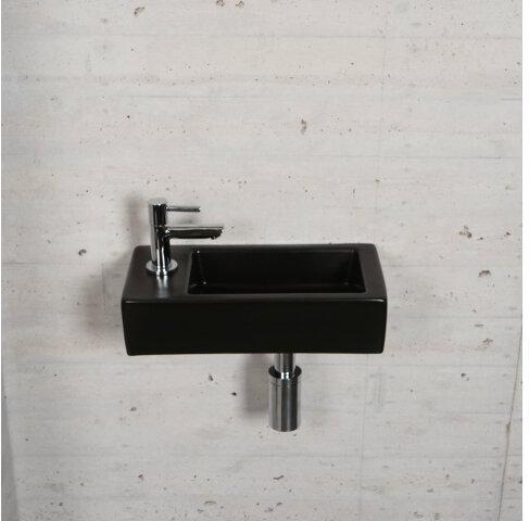 • De fontein heeft een matzwarte tint en een rechthoekige vorm. Het kraangat bevindt zich aan de linkerkant van de fontein.