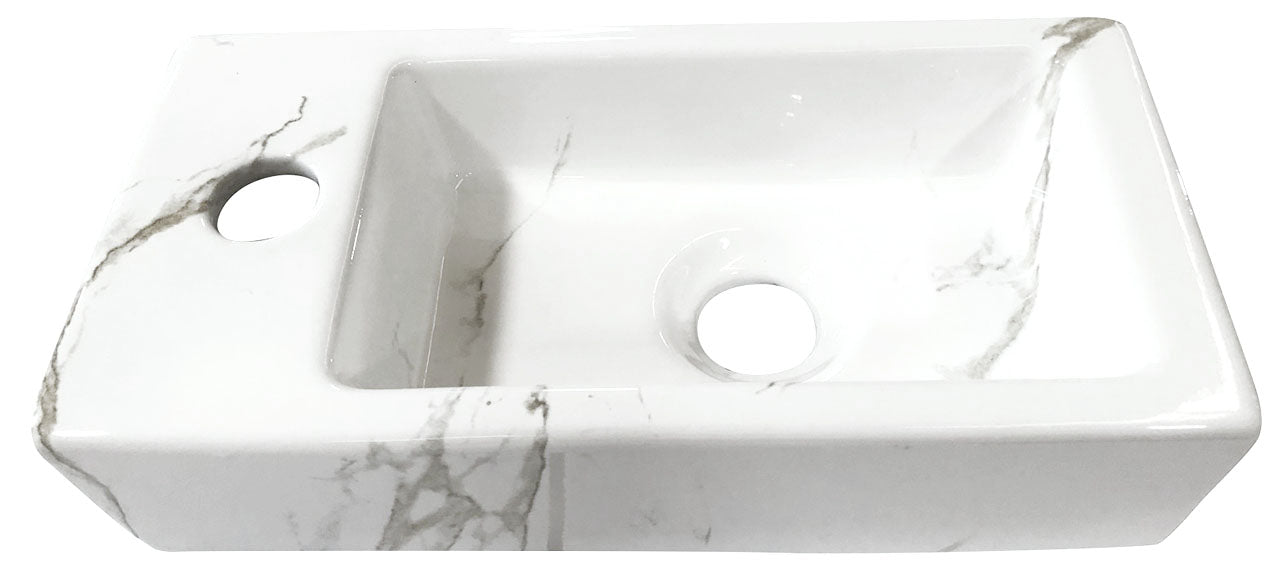 • De fontein heeft een rechthoekige configuratie met een Carrara-afwerking. Het kraangat bevindt zich aan de linkerkant van de fontein.
