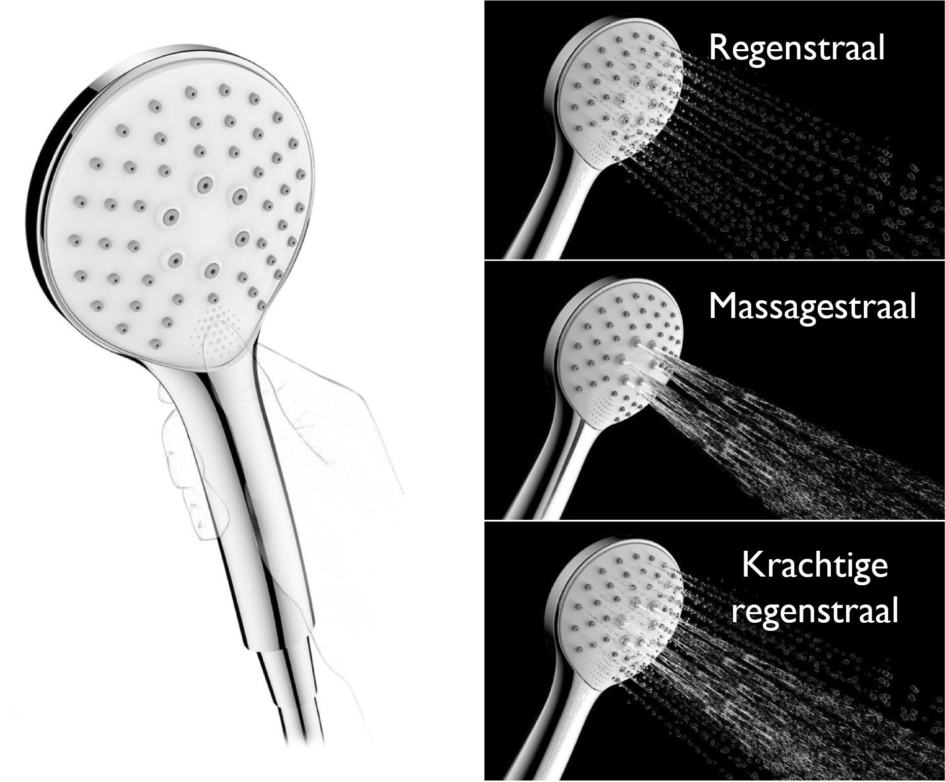 Door middel van een drukknop op de handdouche kun je kiezen tussen drie verschillende straalsoorten. Zo kan iedereen genieten van een comfortabel douche- of badmoment. Deze handdouche is gemaakt van kunststof. Hierdoor is er minder kans op krassen en beschadigingen.