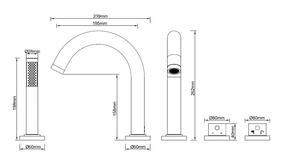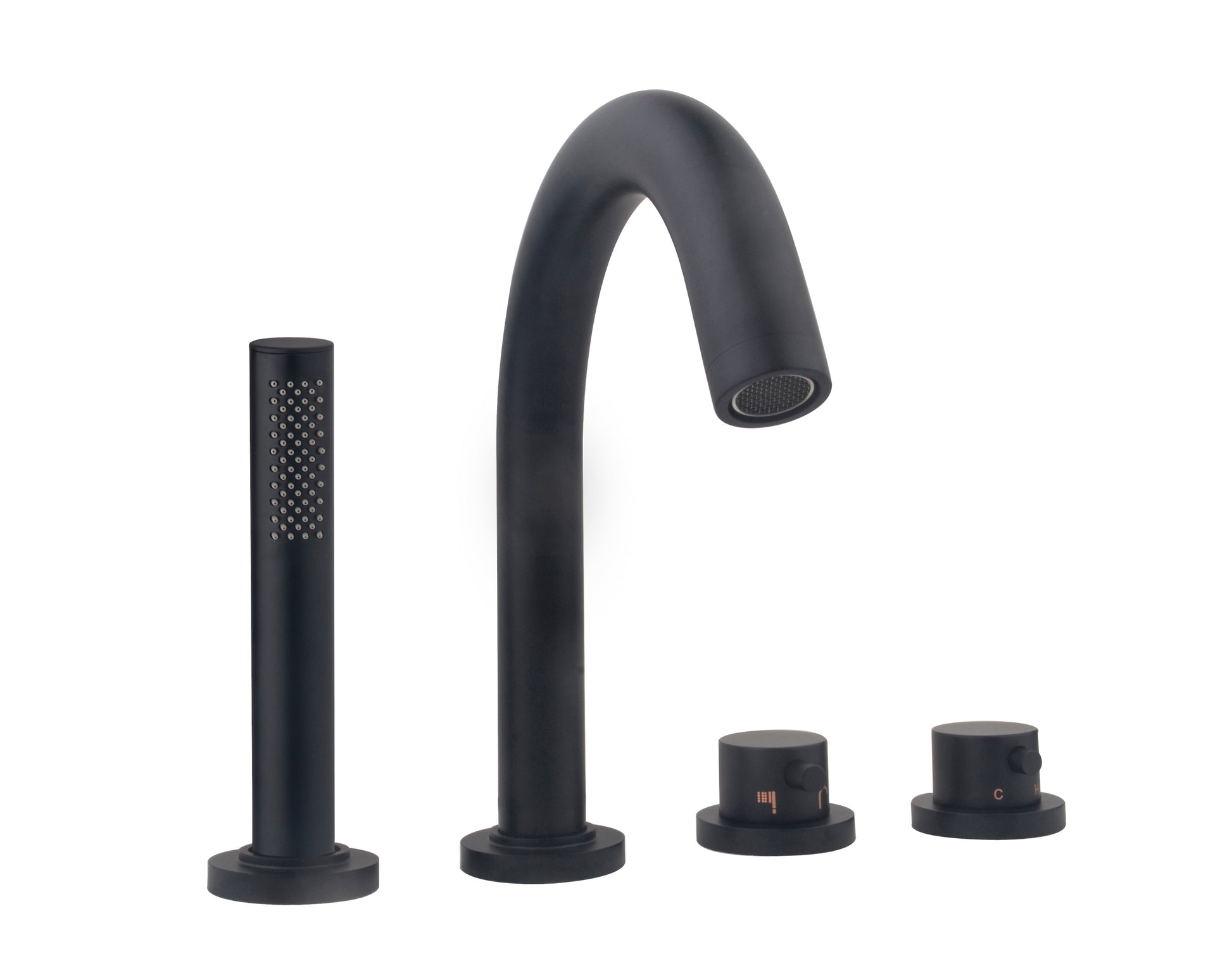 De elegante zwarte afwerkingsset bestaat uit een 4-gats badkraan. In gat 1 bevindt zich de verzonken handdouche met ronde stang, gat 2 is bestemd voor de baduitloop en 3 is de knop die wordt gebruikt om de kraan in en uit te schakelen, en om de wateruitlaat te selecteren. In het geval van de uitloop of de handdouche. De laatste knop is de thermostaat.