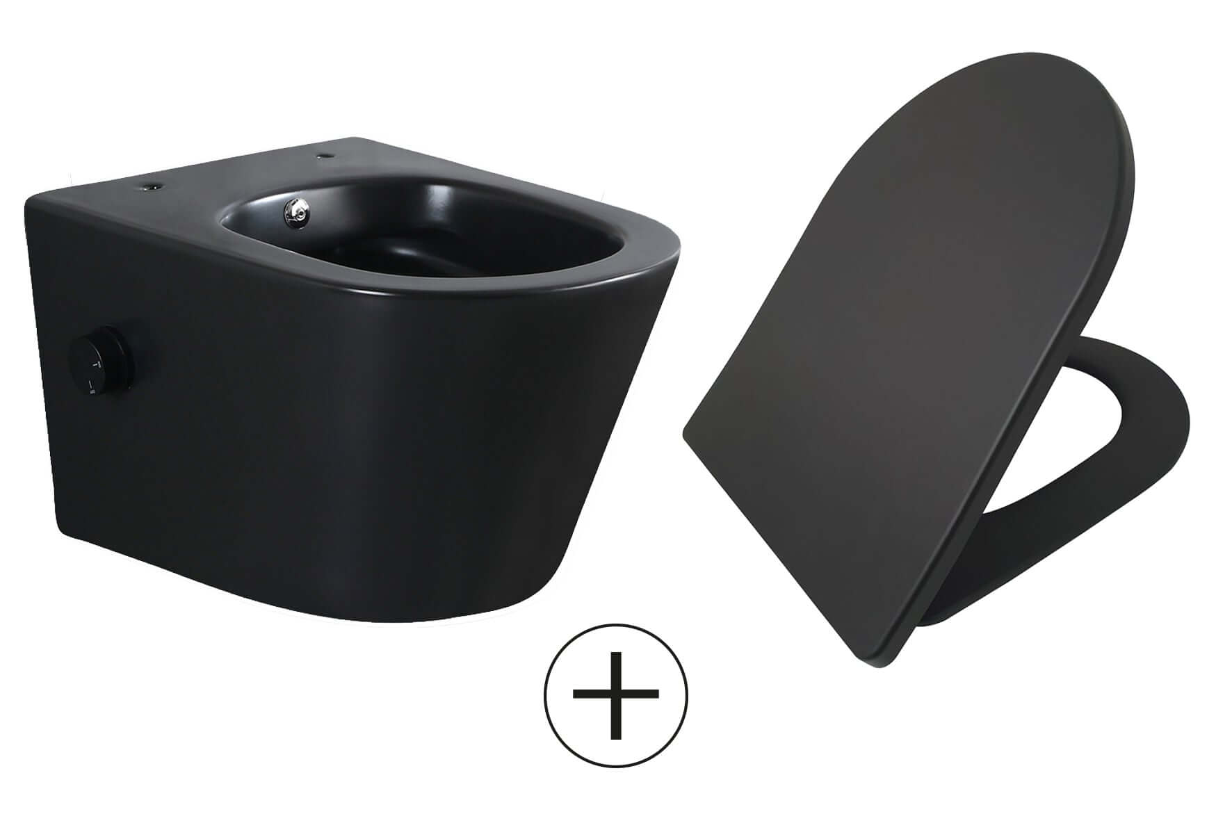 Vesta wandcloset randlos mit Bidetarmatur kaltes Wasser mit Shade schlanker Toilettensitz matt schwarz