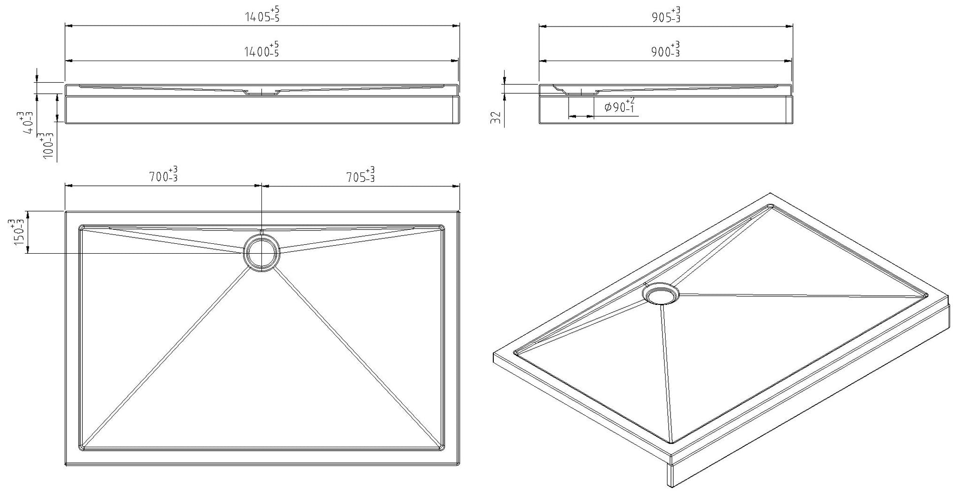 Bac de douche rectangulaire 140 x 90 x 4 cm acrylique brillant blanc
