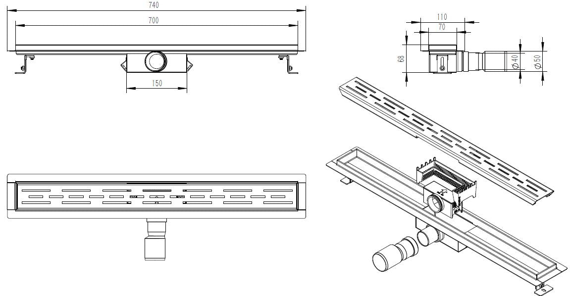 Caniveau de douche avec bride et grille 70 x 7 cm mat noir