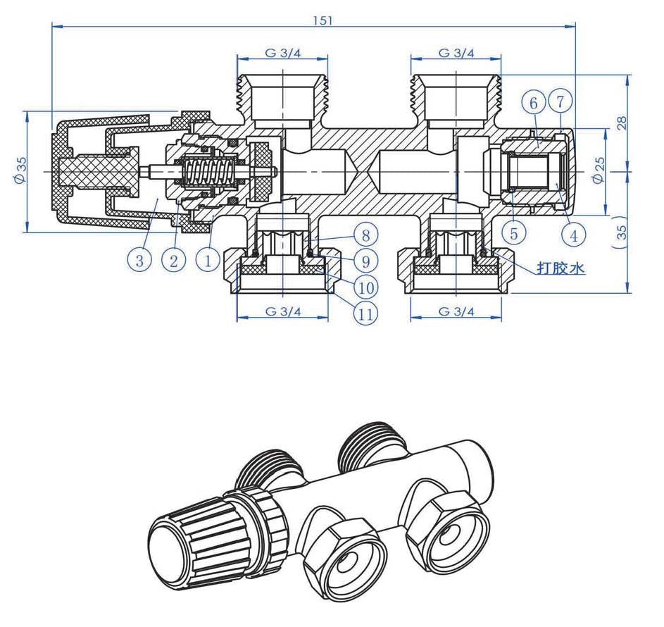 thermostatisch 3/4 onderblok recht