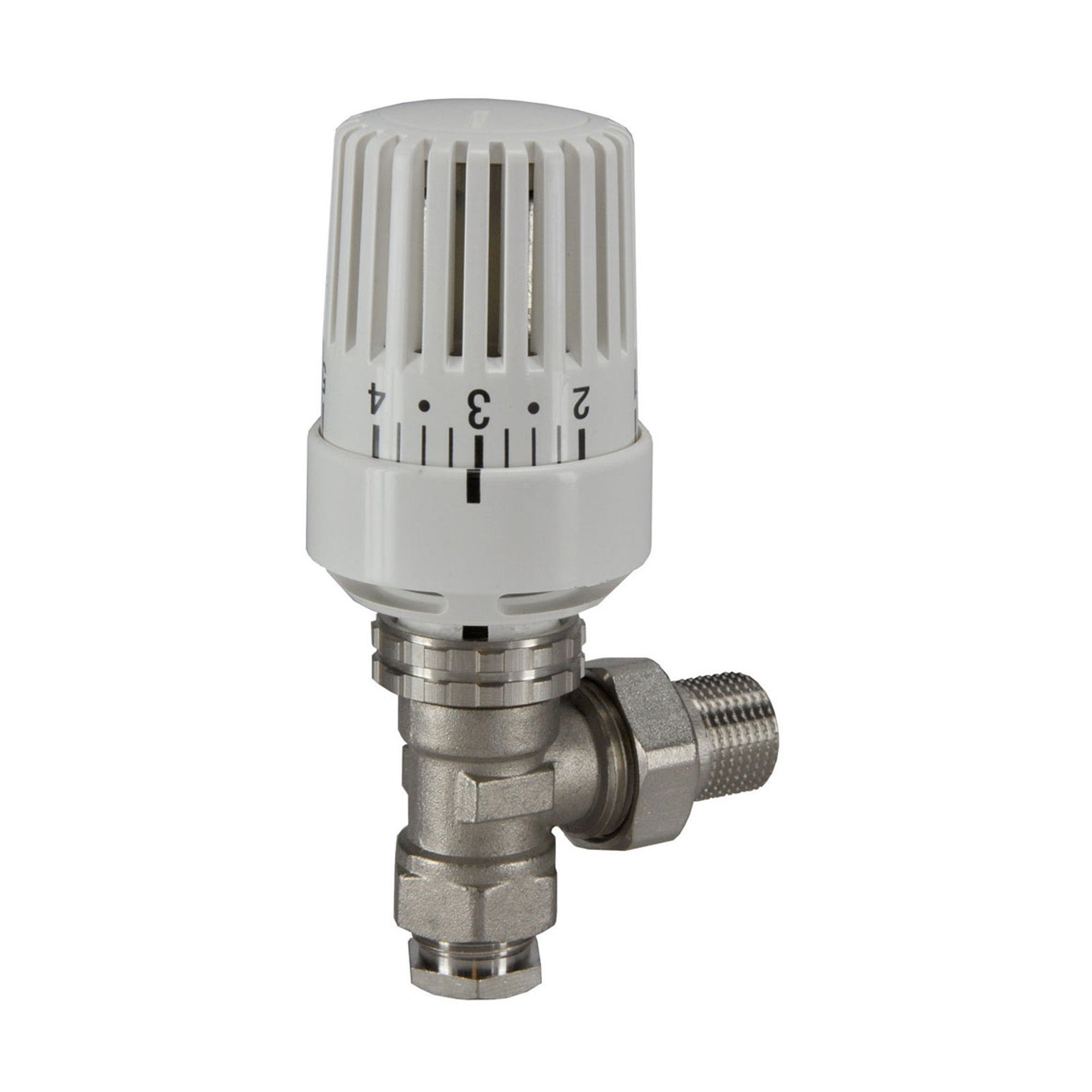 Thermostatisch radiatorventiel 1/2"x15mm haaks inclusief thermostaatknop en knelsetje 1/2"x15mm. Verpakt in full-color doosje , de kraan heeft een beschermkapje, waarmee deze afgesloten kan worden.