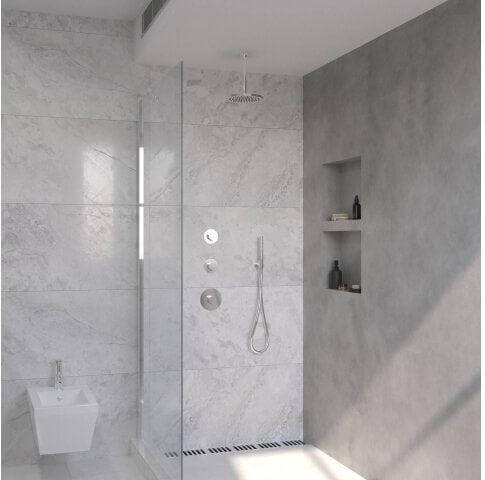 Un système de douche pluie intégré ingénieux pour votre zone de bain. L'ensemble Wiesbaden Dreams complète votre salle de bain. Intégrez l'ensemble de robinetterie de douche chromé avec une paroi de douche aux détails chromés pour parfaire le design de votre salle de bain. Cet ensemble de douche somptueux est exactement ce dont votre salle de bain a besoin.