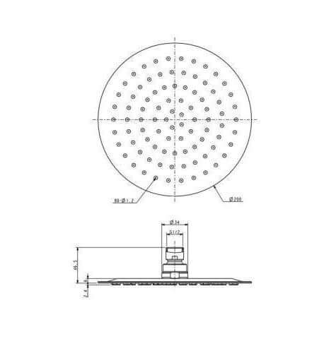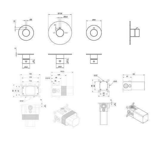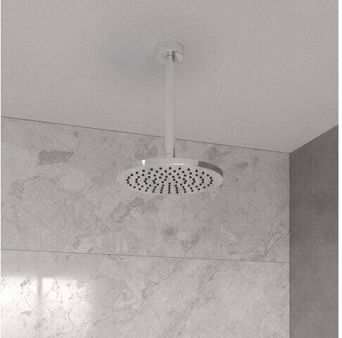 Le diamètre de la pomme de douche est de 20 cm. La sortie plafond mesure 15 cm de long. La douchette a une seule position et mesure 21 cm de long. Le tuyau de douche mesure 150 cm de long et a une surface lisse. Le mitigeur thermostatique a un diamètre de 13,8 cm, tandis que les vannes d'arrêt ont un diamètre de 9 cm. Chacune des trois vannes possède un bouton rond. Le boîtier encastré pour le mitigeur de douche a une profondeur de 15,25 cm, tandis que le boîtier encastré pour les vannes d'arrêt a une profondeur de 15,1 cm.