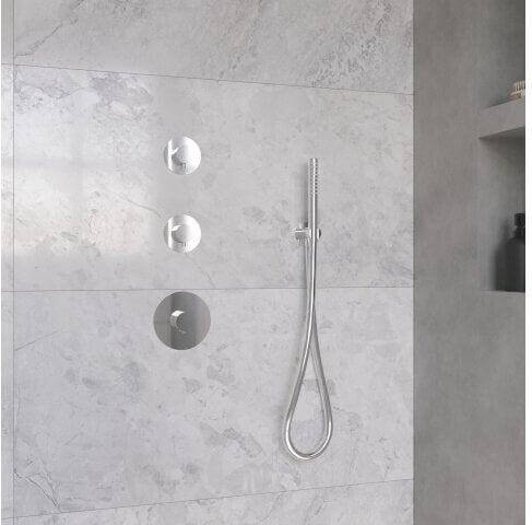 L'ensemble se compose d'un mitigeur thermostatique, de deux vannes d'arrêt, d'une pomme de douche pluie avec sortie plafond associée, d'une connexion murale, d'un tuyau de douche et d'une douchette. Vous pouvez choisir une pomme de douche, une douchette, une sortie plafond et une prise alternatives, ce qui peut entraîner des frais supplémentaires.